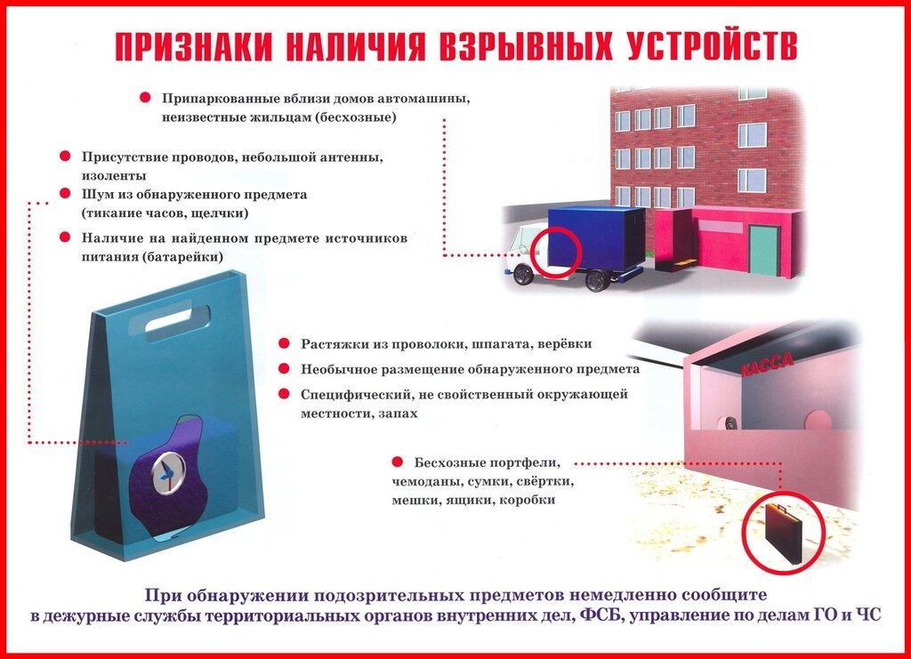 Также необходимо помнить, что внешний вид предмета может скрывать его настоящее назначение. На наличие взрывного устройства, других опасных предметов могут указывать следующие признаки: