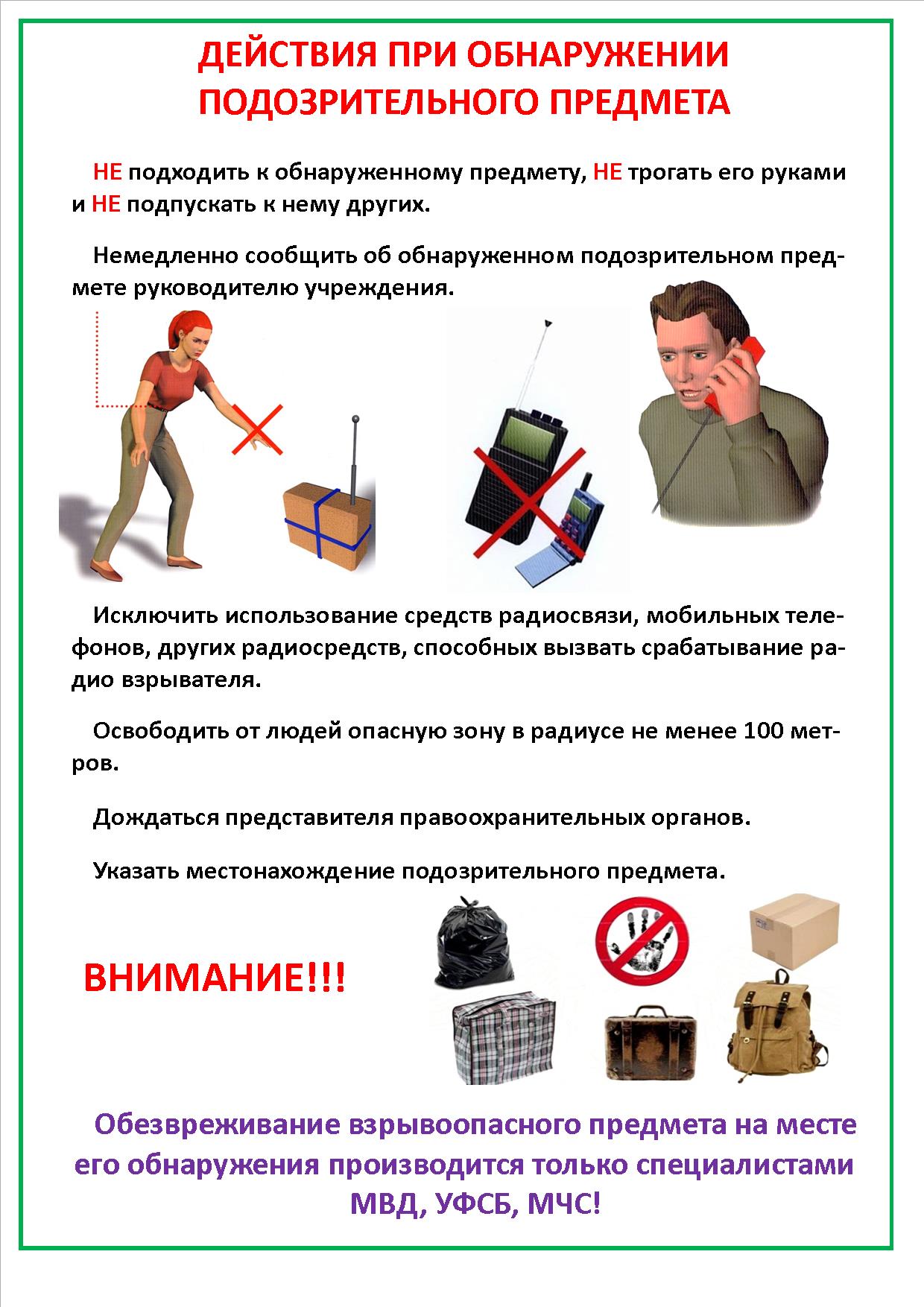 При обнаружении забытых вещей, не трогая их, сообщите об этом водителю, сотрудникам объекта, службы безопасности, полиции. Не пытайтесь заглянуть внутрь подозрительного пакета, коробки, иного предмета.